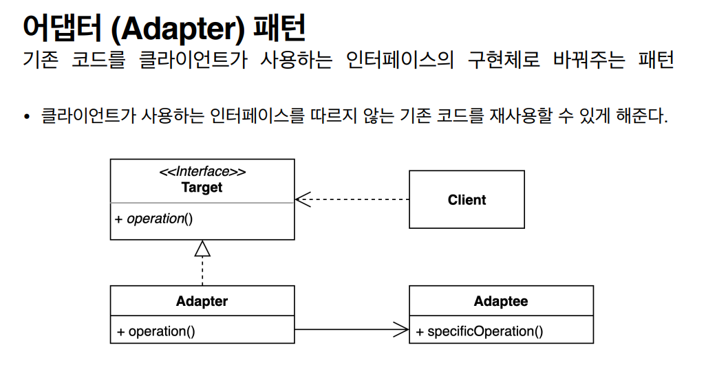 | 기존 코드와 새 코드를 연결 | Adapter | 호환성 유지 |