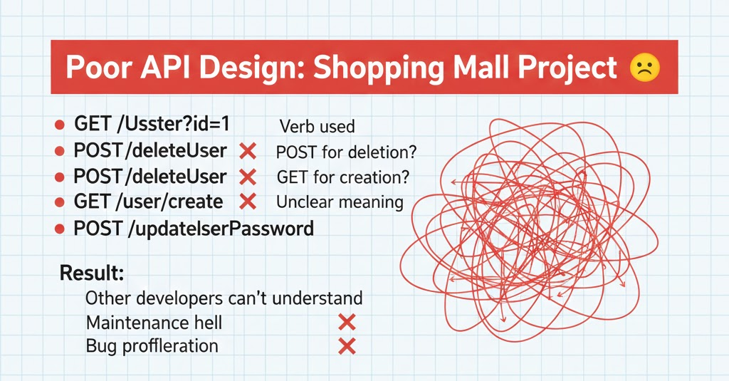 오늘은 백엔드 개발자라면 반드시 알아야 할 REST API 설계를 배웠어요! 그동안 API를 만들긴 했지만, "왜 GET을 써야 하지?", "URL을 어떻게 만들어야 하지?"라는 고민이 많았는데, 오늘 수업을 듣고 나니 설계 원칙이 명확해졌습니다!