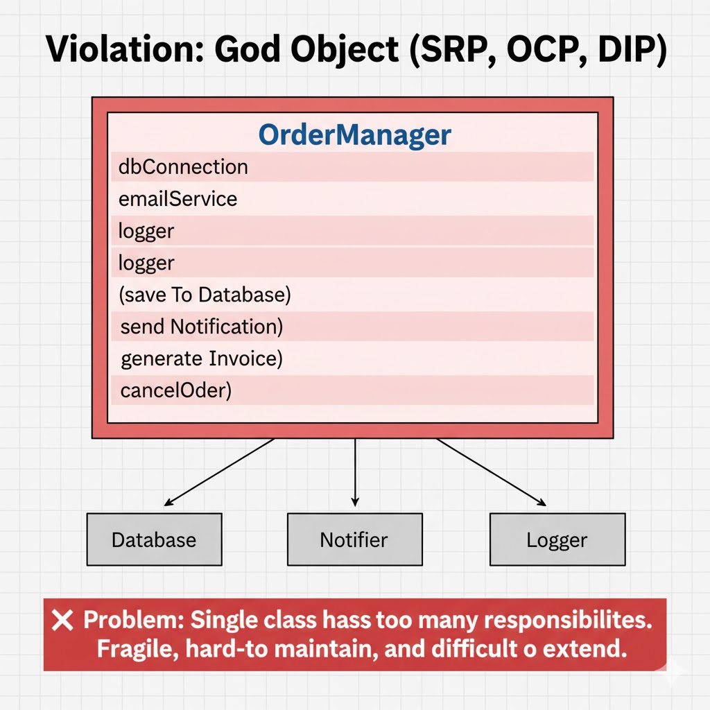 → SRP 위반, OCP 위반, DIP 위반까지 종합세트였다.