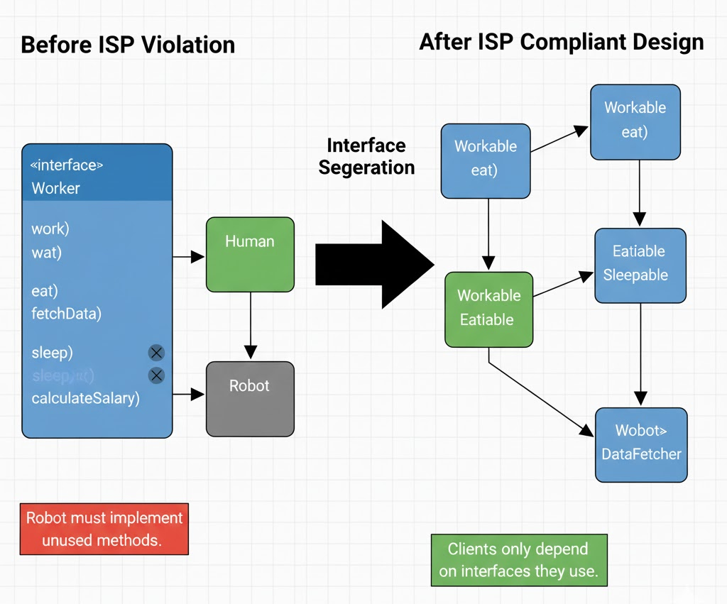 🔹 4. ISP (Interface Segregation Principle — 인터페이스 분리 원칙)