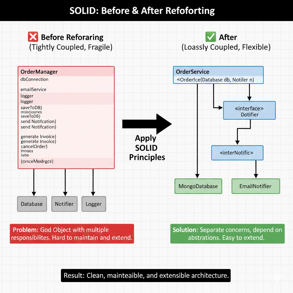 그래서 오늘은 SOLID의 다섯 가지 원칙을 ✅ 개념적 배경 → ✅ 코드 예제 → ✅ 리팩토링 실전 적용 순으로 정리해본다.