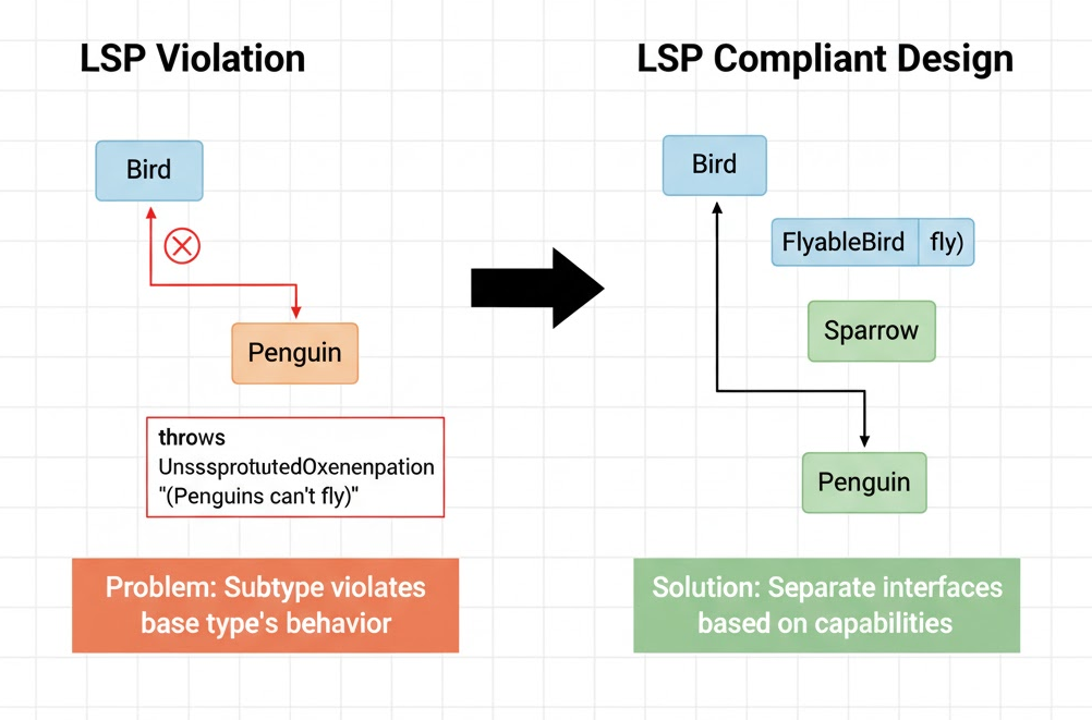 → Penguin은 Bird처럼 행동하지 않으므로 LSP 위반.