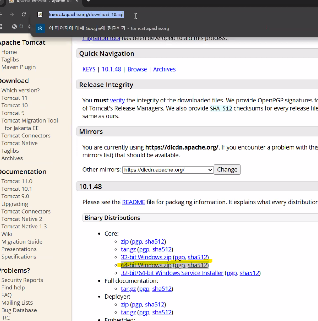 Apache Tomcat 공식 다운로드 페이지에서 10.1.48 버전 선택