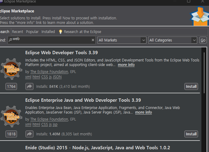 Eclipse Marketplace에서 Web Tools 설치