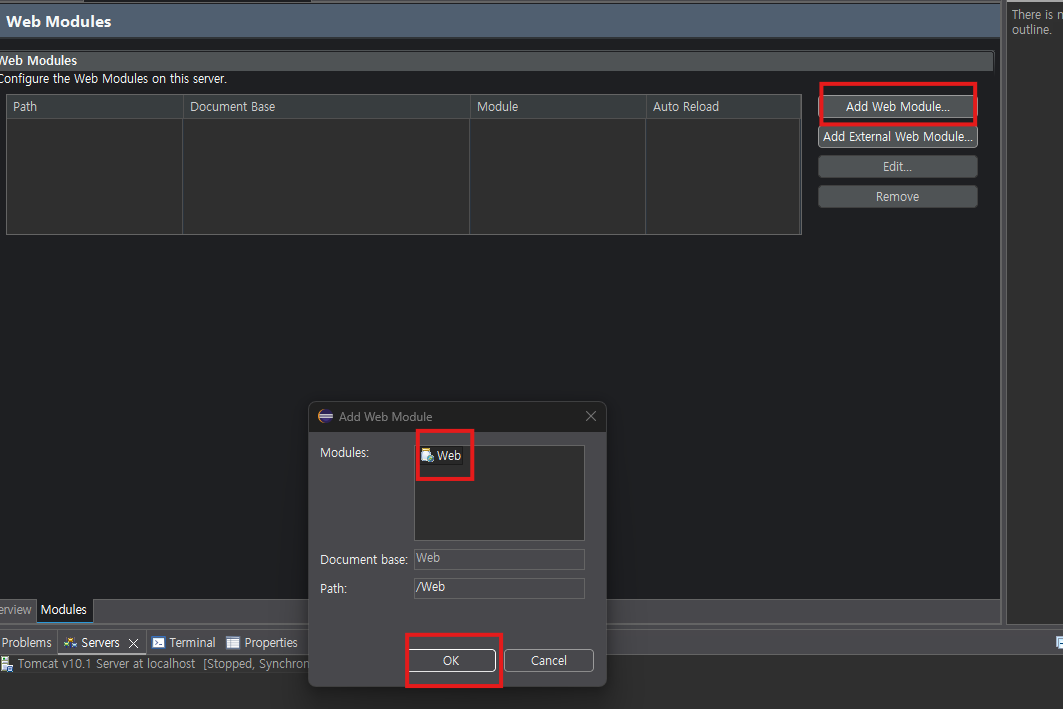 - Servers 뷰 → 서버 더블클릭 → Modules 탭 확인
