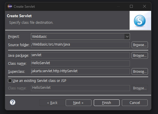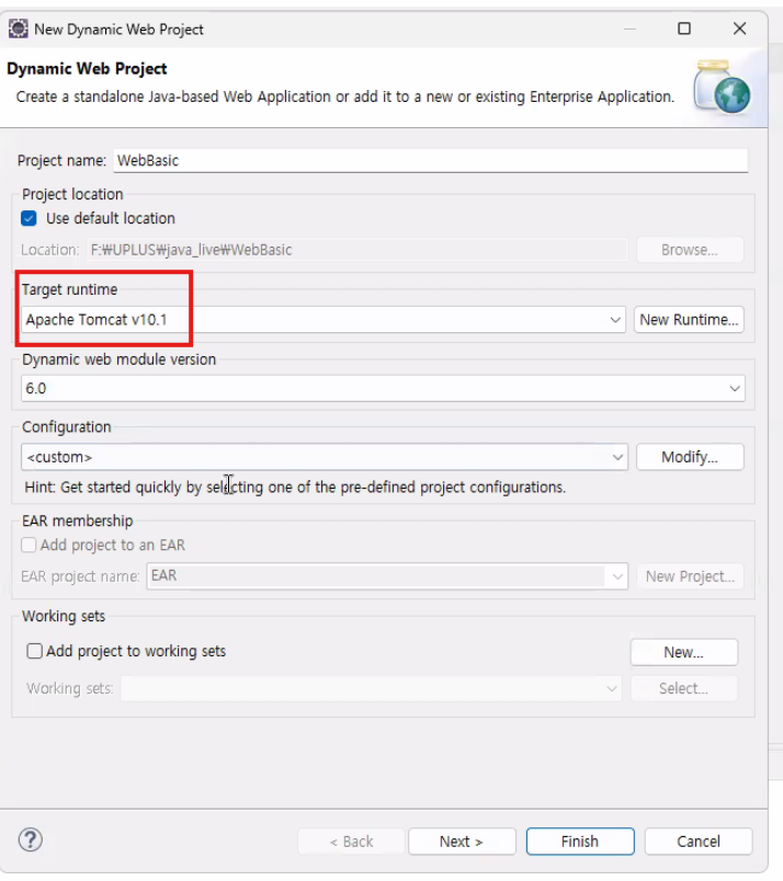 - Target runtime: Apache Tomcat v10.1 (앞서 등록한 서버)