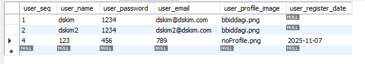 회원가입 성공시 이렇게 mysql에 데이터가 등록 됩니다!
